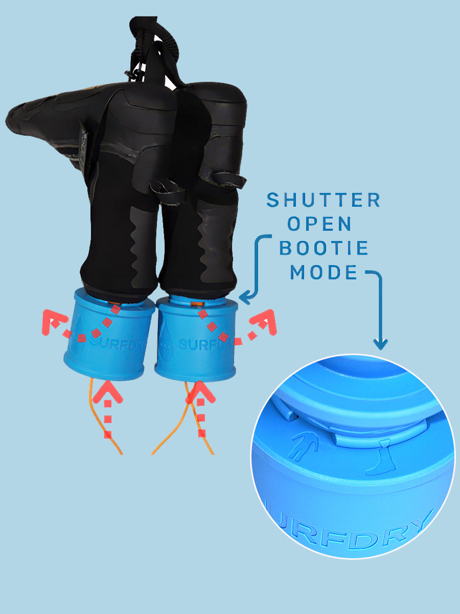 The SURFDRY Original dries your wetsuit and booties by sucking dry air through your gear.